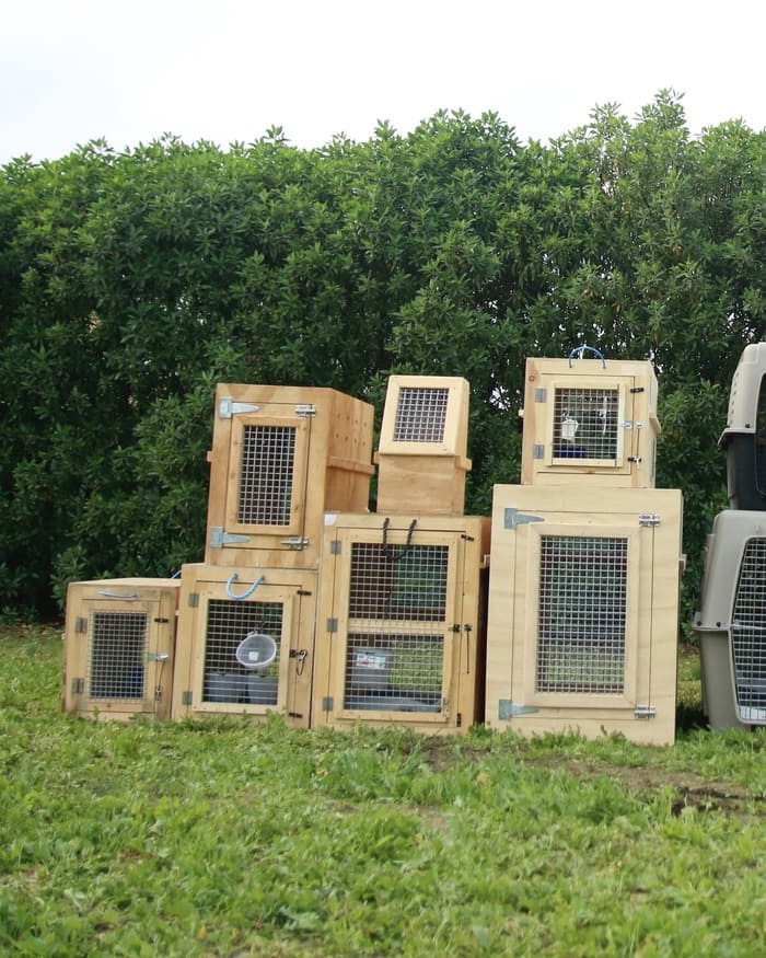 - Two bowls or containers for drinking and eating must be attached to the inside of the crate, with outside access for filling.
